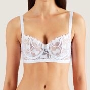 This version of the Half Cup bra is available up to cup size G for more voluptuous women. With its underwiring and reinforced back construction, its seductive feel extends into its generous cleavage. The skin is skimmed with lightweight voile that hints at the nudity beneath whilst featuring a striking bow for a very couture feel.